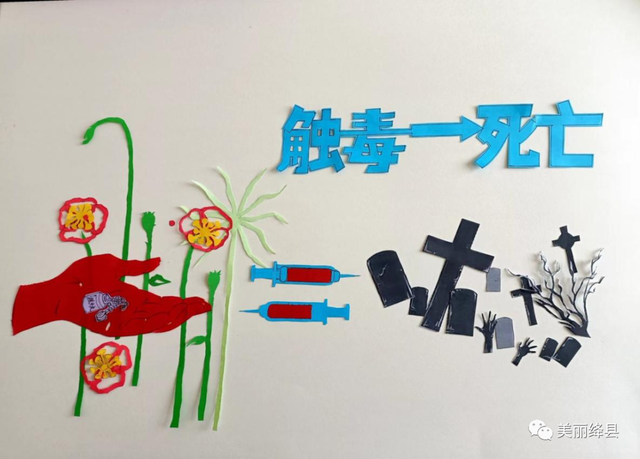 活动前,大家通过上网查资料,积极献策,共同商讨,最后作品的主题定稿为《触毒→死亡》,寓意是一只红色的手代表了一条鲜活的生命,在人生的旅途中,一个人无论经济基础多好,社会地位多高,生存环境多优越,只要自己不自律,接触毒品,终将走向坟墓。